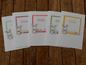 Die 5 Eier aus dem Set Osterkörbchen habe ich jeweils 1x in Farngrün, Zarte Pflaume, Flamingorot, Osterglocke und Aquamarin gestempelt.